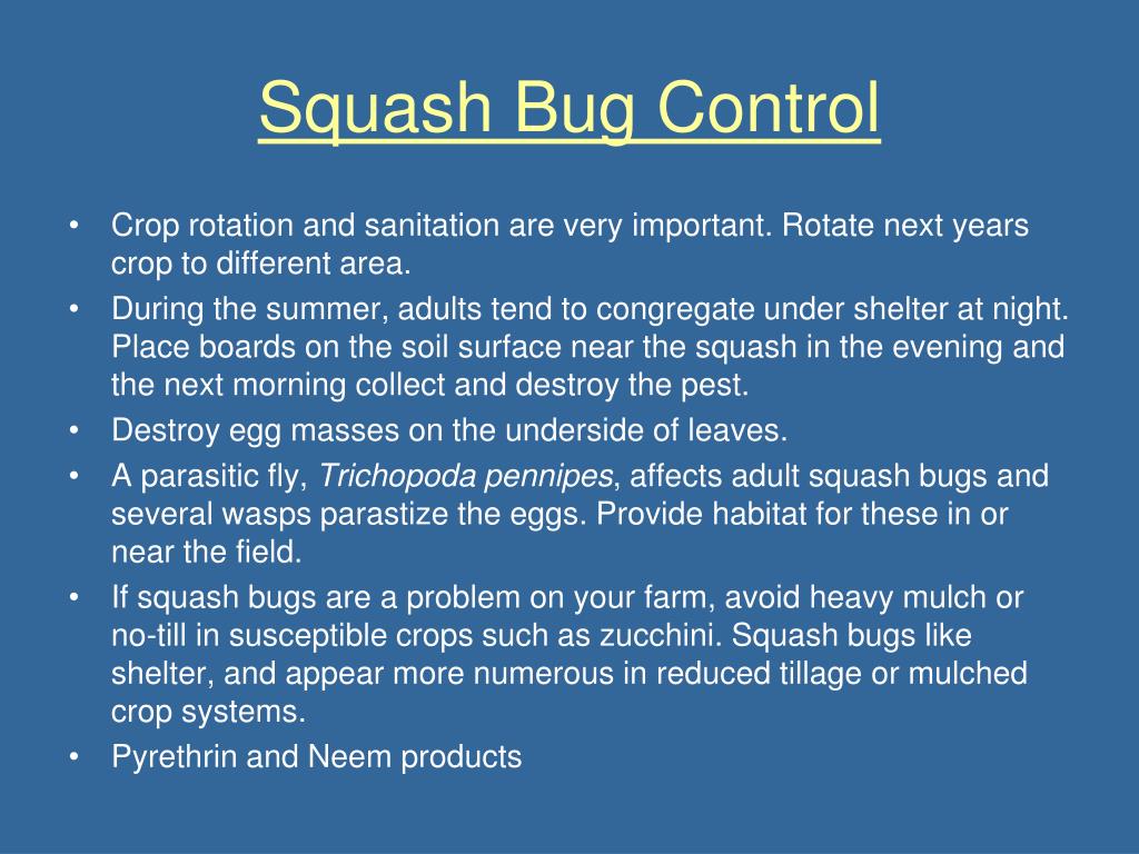 Squash Bug Control • Crop rotation and sanitation are very important. Rotate next years crop to different area. • During the summer, adults tend to congregate under shelter at night. Place boards on the soil surface near the squash in the evening and the next morning collect and destroy the pest. • Destroy egg masses on the underside of leaves. • A parasitic fly, Trichopodapennipes, affects adult squash bugs and several wasps parastize the eggs. Provide habitat for these in or near the field. • If squash bugs are a problem on your farm, avoid heavy mulch or no-till in susceptible crops such as zucchini. Squash bugs like shelter, and appear more numerous in reduced tillage or mulched crop systems. • Pyrethrin and Neem products