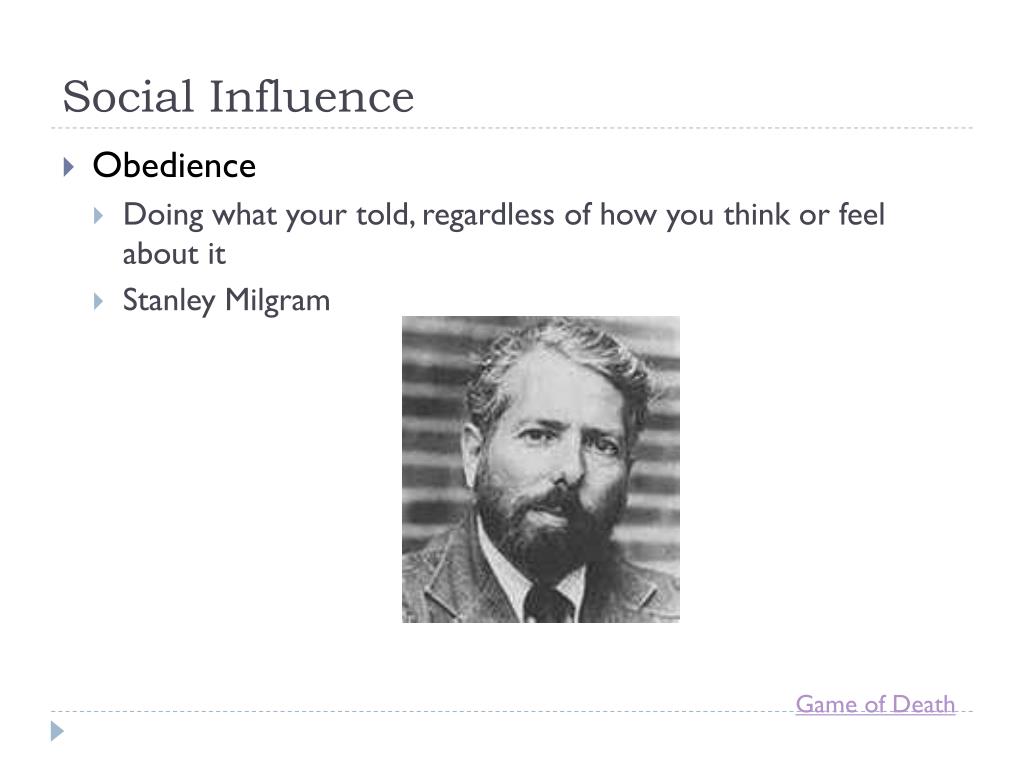 Social Influence • Obedience • Doing what your told, regardless of how you think or feel about it • Stanley Milgram Game of Death