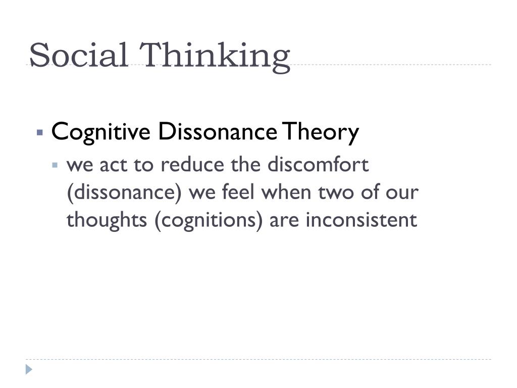 Social Thinking • Cognitive Dissonance Theory • we act to reduce the discomfort (dissonance) we feel when two of our thoughts (cognitions) are inconsistent