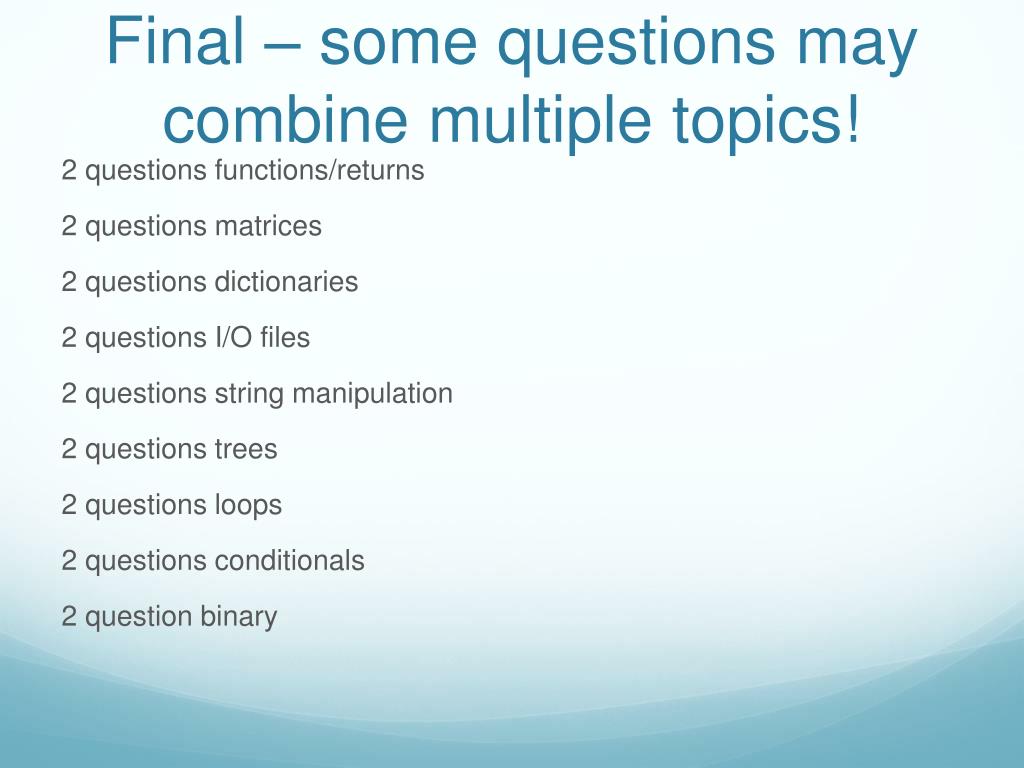 Final – some questions may combine multiple topics! 2 questions functions/returns 2 questions matrices 2 questions dictionaries 2 questions I/O files 2 questions string manipulation 2 questions trees 2 questions loops 2 questions conditionals 2 question binary