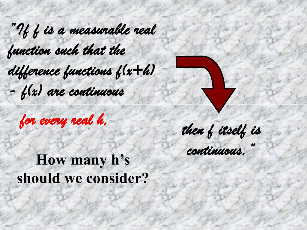 ”If f is a measurable real function such that the difference functions f(x+h) - f(x) are continuous for every real h, for every real h, then f itself is continuous.” How many h’s should we consider?