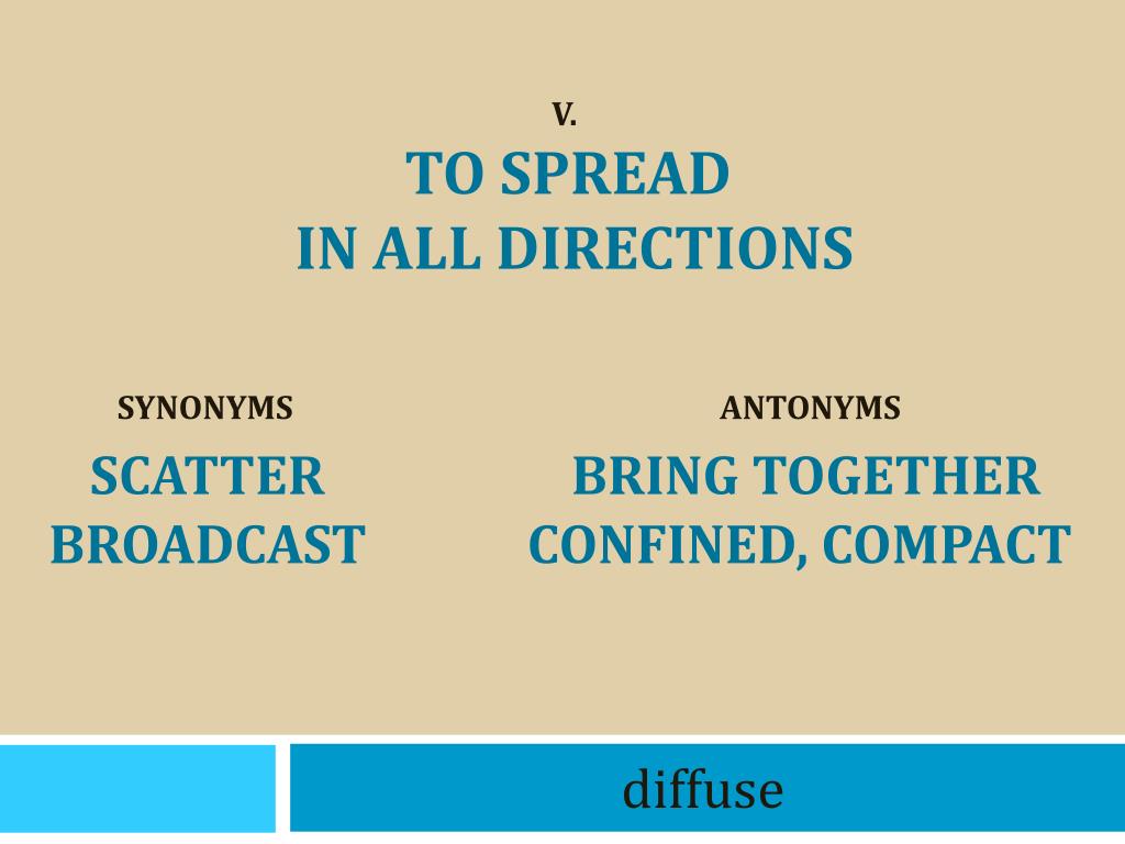 V. to spread in all directionssynonyms antonymsscatter bring togetherbroadcast confined, compact diffuse