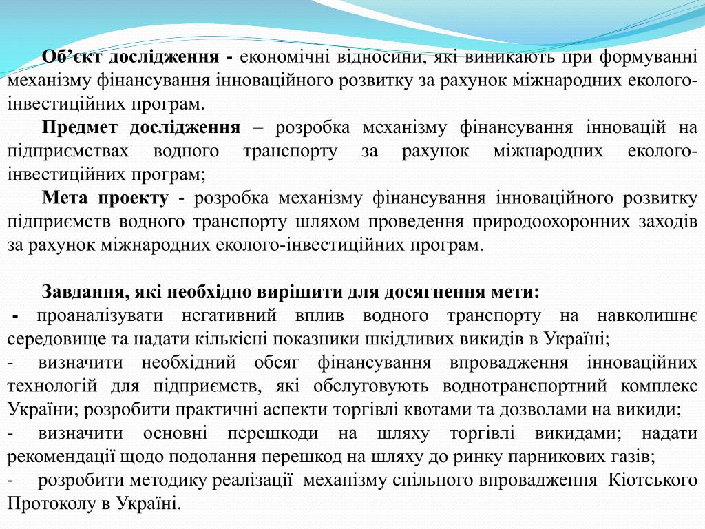 Об’єкт дослідження - економічні відносини, які виникають при формуванні механізму фінансування інноваційного розвитку за рахунок міжнародних еколого-інвестиційних програм. Предмет дослідження – розробка механізму фінансування інновацій на підприємствах водного транспорту за рахунок міжнародних еколого-інвестиційних програм; Мета проекту - розробка механізму фінансування інноваційного розвитку підприємств водного транспорту шляхом проведення природоохоронних заходів за рахунок міжнародних еколого-інвестиційних програм. Завдання, які необхідно вирішити для досягнення мети: - проаналізувати негативний вплив водного транспорту на навколишнє середовище та надати кількісні показники шкідливих викидів в Україні; • визначити необхідний обсяг фінансування впровадження інноваційних технологій для підприємств, які обслуговують воднотранспортний комплекс України; розробити практичні аспекти торгівлі квотами та дозволами на викиди; • визначити основні перешкоди на шляху торгівлі викидами; надати рекомендації щодо подолання перешкод на шляху до ринку парникових газів; • розробити методику реалізації механізму спільного впровадження Кіотського Протоколу в Україні.