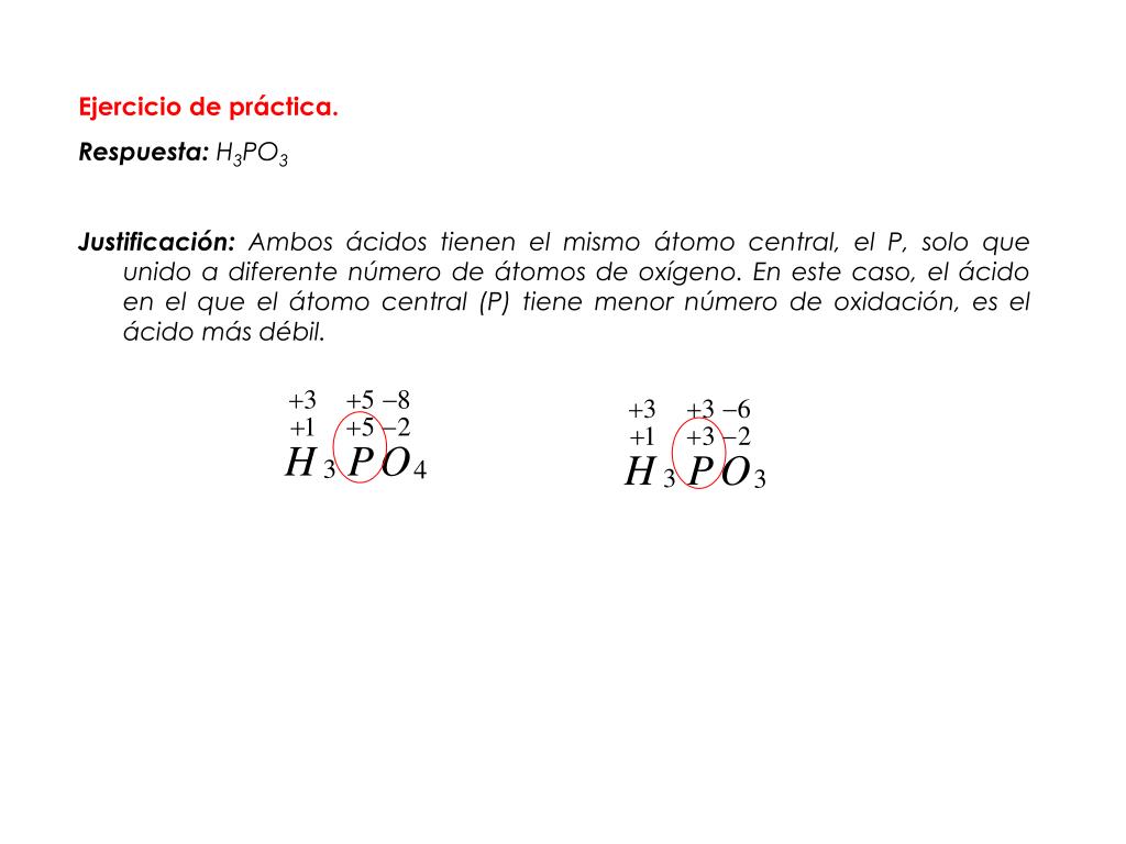 Ejercicio de práctica. Respuesta: H3PO3 Justificación: Ambos ácidos tienen el mismo átomo central, el P, solo que unido a diferente número de átomos de oxígeno. En este caso, el ácido en el que el átomo central (P) tiene menor número de oxidación, es el ácido más débil.