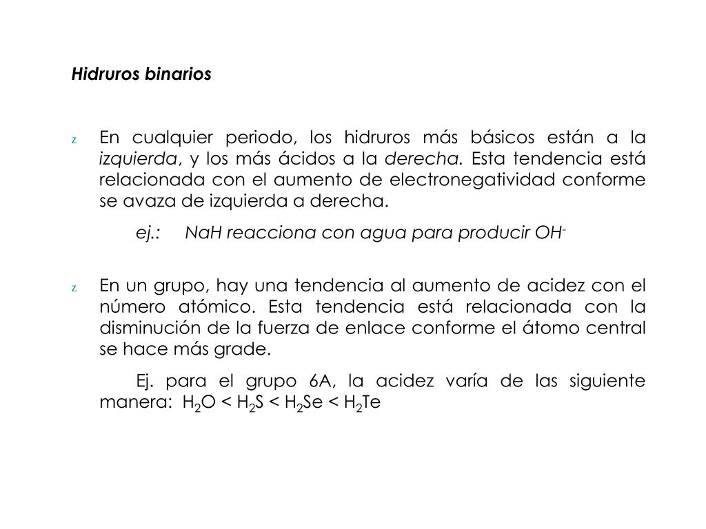 Hidruros binarios • En cualquier periodo, los hidruros más básicos están a la izquierda, y los más ácidos a la derecha. Esta tendencia está relacionada con el aumento de electronegatividad conforme se avaza de izquierda a derecha. ej.: NaH reacciona con agua para producir OH- • En un grupo, hay una tendencia al aumento de acidez con el número atómico. Esta tendencia está relacionada con la disminución de la fuerza de enlace conforme el átomo central se hace más grade. Ej. para el grupo 6A, la acidez varía de las siguiente manera: H2O < H2S < H2Se < H2Te