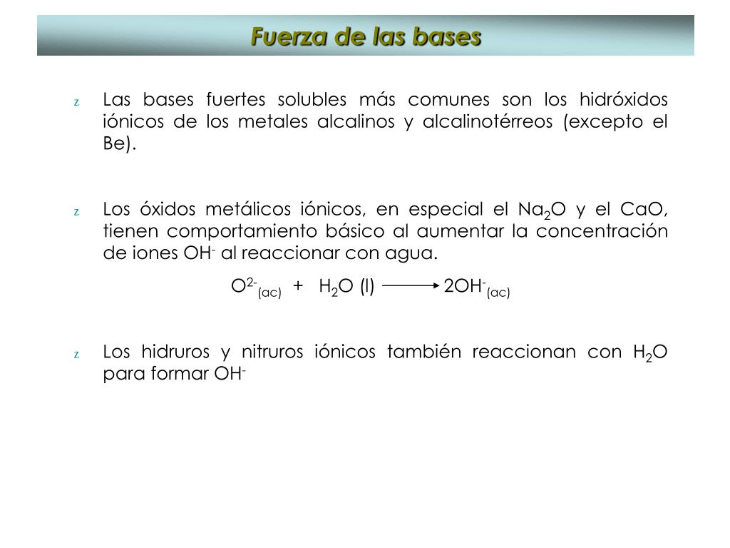Fuerza de las bases • Las bases fuertes solubles más comunes son los hidróxidos iónicos de los metales alcalinos y alcalinotérreos (excepto el Be). • Los óxidos metálicos iónicos, en especial el Na2O y el CaO, tienen comportamiento básico al aumentar la concentración de iones OH- al reaccionar con agua. O2-(ac) + H2O (l) 2OH-(ac) • Los hidruros y nitruros iónicos también reaccionan con H2O para formar OH-