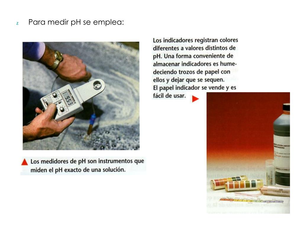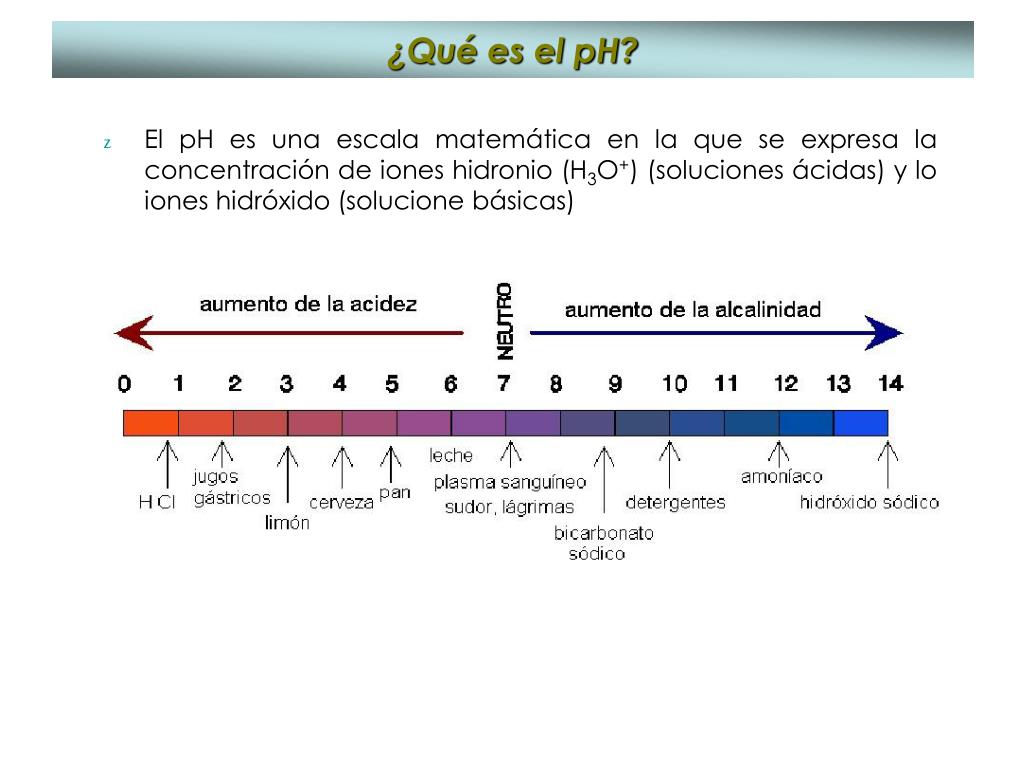 ¿Qué es el pH? • El pH es una escala matemática en la que se expresa la concentración de iones hidronio (H3O+) (soluciones ácidas) y lo iones hidróxido (solucione básicas)