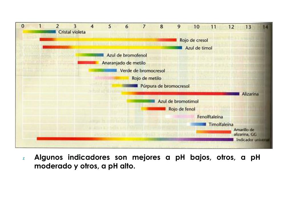 Algunos indicadores son mejores a pH bajos, otros, a pH moderado y otros, a pH alto.
