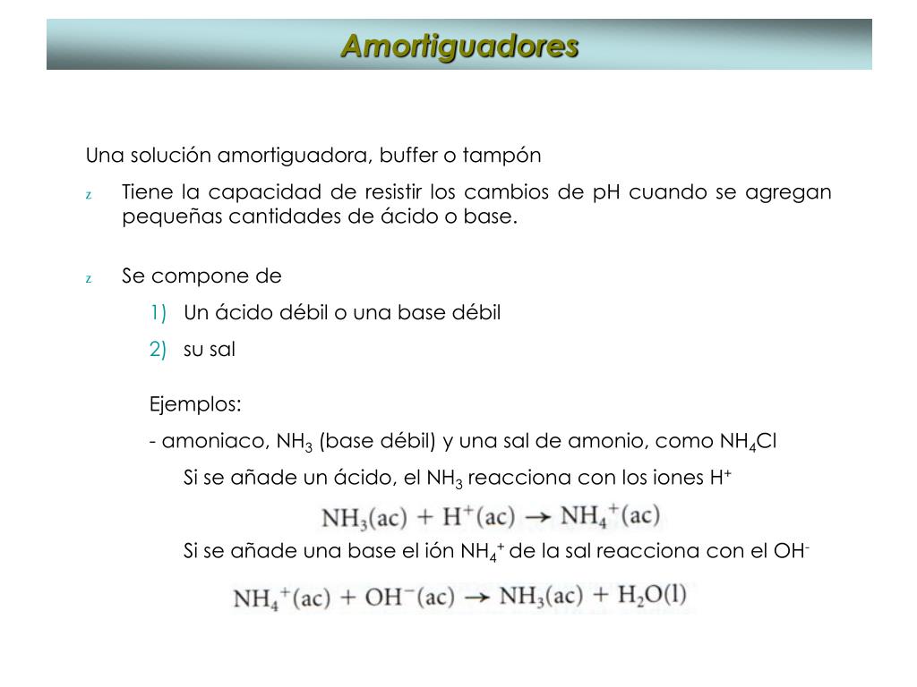 Amortiguadores Una solución amortiguadora, buffer o tampón • Tiene la capacidad de resistir los cambios de pH cuando se agregan pequeñas cantidades de ácido o base. • Se compone de • Un ácido débil o una base débil • su sal Ejemplos: - amoniaco, NH3 (base débil) y una sal de amonio, como NH4Cl Si se añade un ácido, el NH3 reacciona con los iones H+ Si se añade una base el ión NH4+ de la sal reacciona con el OH-