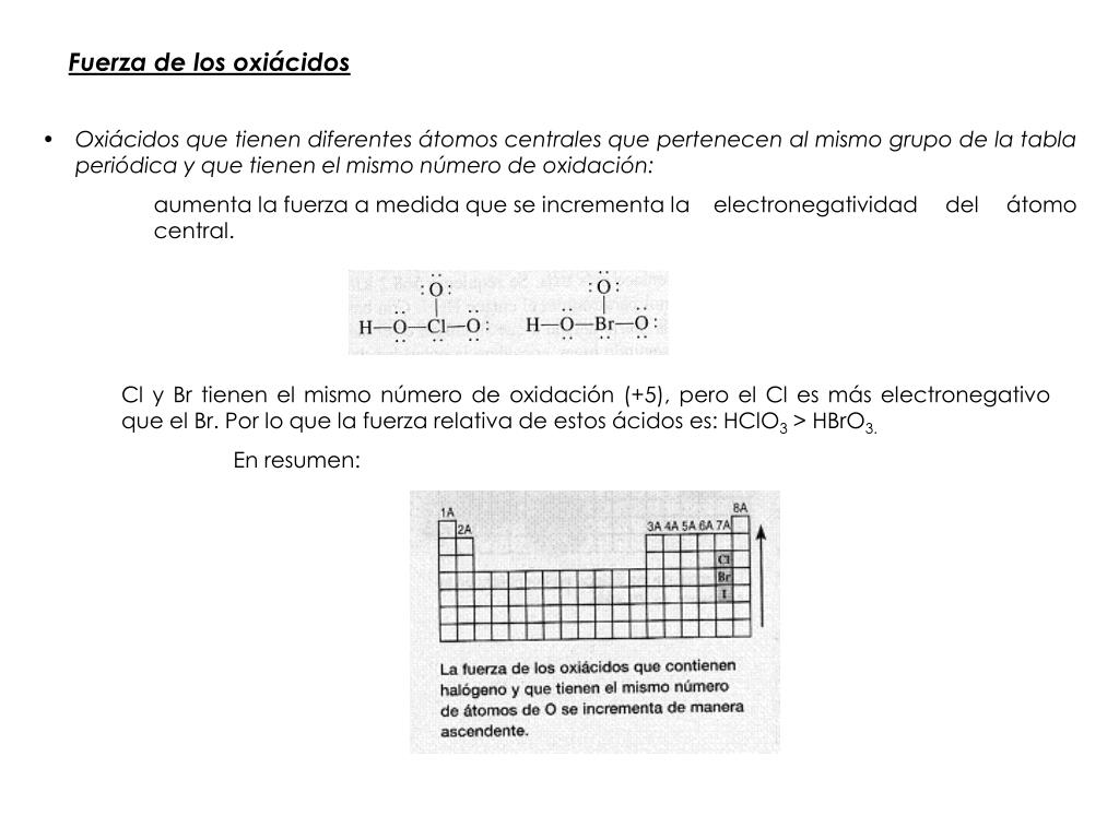 Fuerza de los oxiácidos • Oxiácidos que tienen diferentes átomos centrales que pertenecen al mismo grupo de la tabla periódica y que tienen el mismo número de oxidación: • aumenta la fuerza a medida que se incrementa la electronegatividad del átomo central. Cl y Br tienen el mismo número de oxidación (+5), pero el Cl es más electronegativo que el Br. Por lo que la fuerza relativa de estos ácidos es: HClO3 > HBrO3. En resumen:
