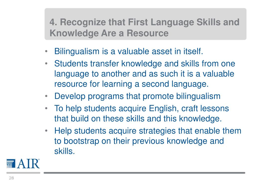 4. Recognize that First Language Skills and Knowledge Are a Resource • Bilingualism is a valuable asset in itself. • Students transfer knowledge and skills from one language to another and as such it is a valuable resource for learning a second language. • Develop programs that promote bilingualism • To help students acquire English, craft lessons that build on these skills and this knowledge. • Help students acquire strategies that enable them to bootstrap on their previous knowledge and skills.
