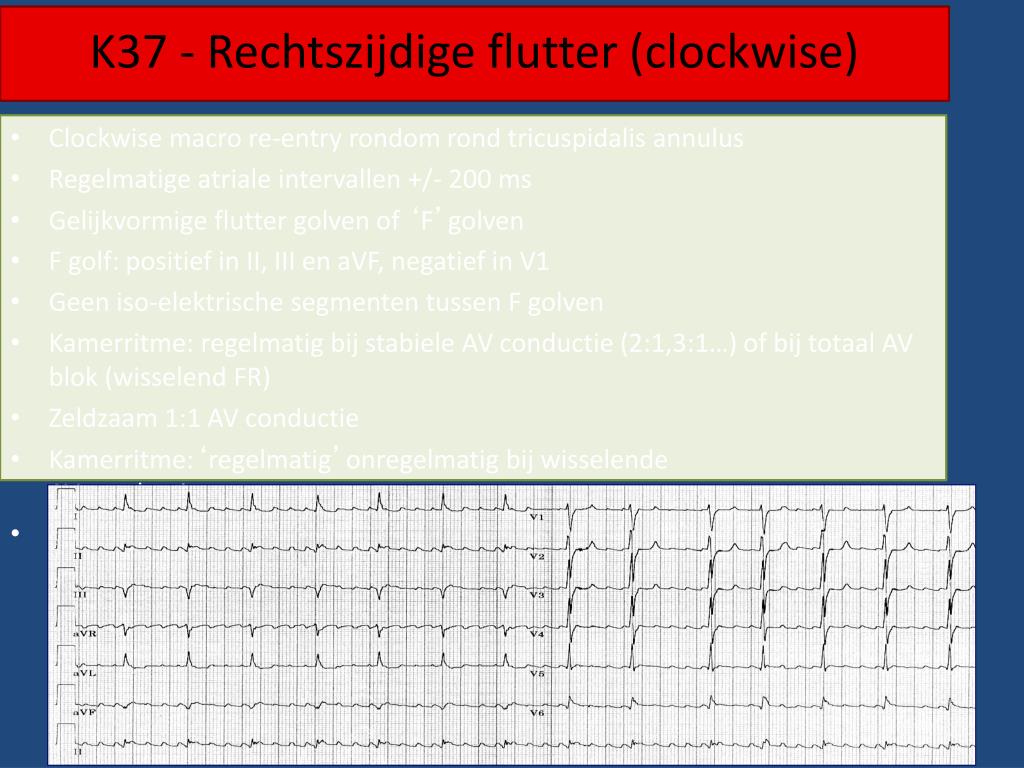 K37 - Rechtszijdige flutter (clockwise) Clockwise macro re-entry rondom rond tricuspidalis annulus Regelmatige atriale intervallen +/- 200 ms Gelijkvormige flutter golven of ‘F’golven F golf: positief in II, III en aVF, negatief in V1 Geen iso-elektrische segmenten tussen F golven Kamerritme: regelmatig bij stabiele AV conductie (2:1,3:1…) of bij totaal AV blok (wisselend FR) Zeldzaam 1:1 AV conductie Kamerritme:‘regelmatig’onregelmatig bij wisselende AV conductie Slank QRS tenzij BTB