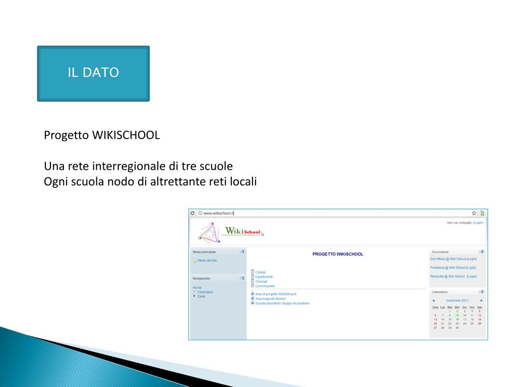 IL DATO Progetto WIKISCHOOL Una rete interregionale di tre scuole Ogni scuola nodo di altrettante reti locali