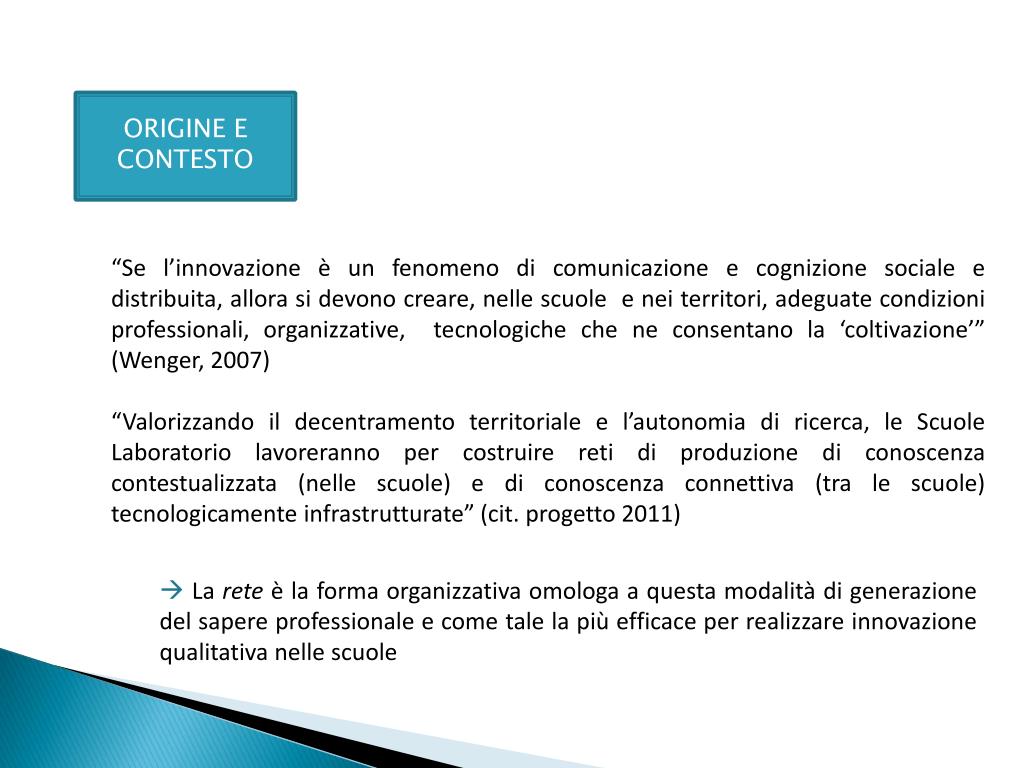 ORIGINE E CONTESTO “Se l’innovazione è un fenomeno di comunicazione e cognizione sociale e distribuita, allora si devono creare, nelle scuole e nei territori, adeguate condizioni professionali, organizzative, tecnologiche che ne consentano la ‘coltivazione’” (Wenger, 2007) “Valorizzando il decentramento territoriale e l’autonomia di ricerca, le Scuole Laboratorio lavoreranno per costruire reti di produzione di conoscenza contestualizzata (nelle scuole) e di conoscenza connettiva (tra le scuole) tecnologicamente infrastrutturate” (cit. progetto 2011) La rete è la forma organizzativa omologa a questa modalità di generazione del sapere professionale e come tale la più efficace per realizzare innovazione qualitativa nelle scuole