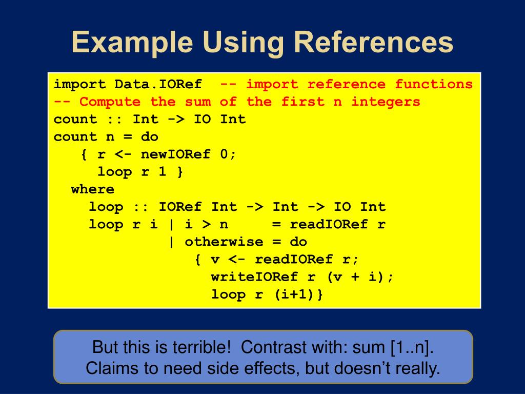 Example Using References import Data.IORef -- import reference functions -- Compute the sum of the first n integers count :: Int -> IO Int count n = do { r <- newIORef 0; loop r 1 } where loop :: IORef Int -> Int -> IO Int loop r i | i > n = readIORef r | otherwise = do { v <- readIORef r; writeIORef r (v + i); loop r (i+1)} But this is terrible! Contrast with: sum [1..n]. Claims to need side effects, but doesn’t really.