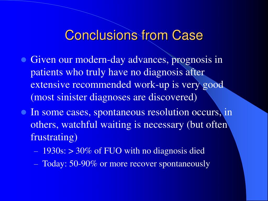 Conclusions from Case • Given our modern-day advances, prognosis in patients who truly have no diagnosis after extensive recommended work-up is very good (most sinister diagnoses are discovered) • In some cases, spontaneous resolution occurs, in others, watchful waiting is necessary (but often frustrating) • 1930s: > 30% of FUO with no diagnosis died • Today: 50-90% or more recover spontaneously