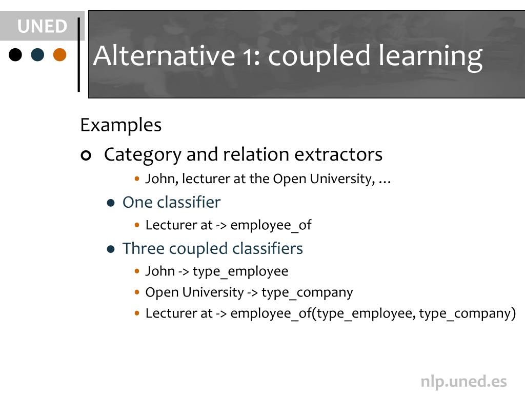 Alternative 1: coupled learning Examples • Category and relation extractors • John, lecturer at the Open University, … • One classifier • Lecturer at -> employee_of • Three coupled classifiers • John -> type_employee • Open University -> type_company • Lecturer at -> employee_of(type_employee, type_company)