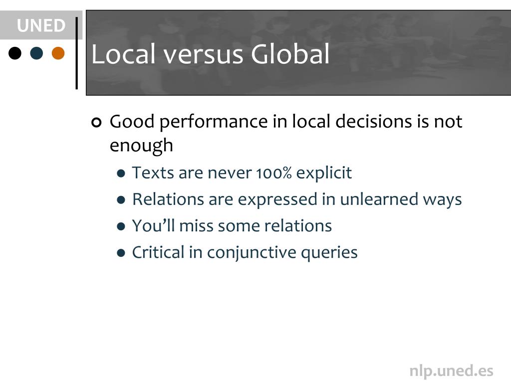 Local versus Global • Good performance in local decisionsisnotenough • Texts are never 100% explicit • Relations are expressed in unlearnedways • You’ll miss somerelations • Critical in conjunctivequeries
