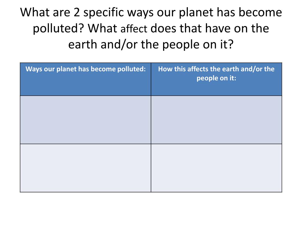 What are 2 specific ways our planet has become polluted? What affect does that have on the earth and/or the people on it?