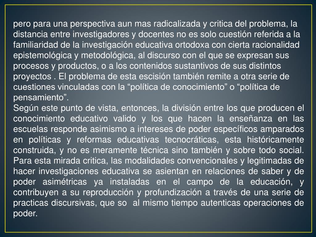 pero para una perspectiva aun mas radicalizada y critica del problema, la distancia entre investigadores y docentes no es solo cuestión referida a la familiaridad de la investigación educativa ortodoxa con cierta racionalidad epistemológica y metodológica, al discurso con el que se expresan sus procesos y productos, o a los contenidos sustantivos de sus distintos proyectos . El problema de esta escisión también remite a otra serie de cuestiones vinculadas con la “política de conocimiento” o “política de pensamiento”. Según este punto de vista, entonces, la división entre los que producen el conocimiento educativo valido y los que hacen la enseñanza en las escuelas responde asimismo a intereses de poder específicos amparados en políticas y reformas educativas tecnocráticas, esta históricamente construida, y no es meramente técnica sino también y sobre todo social. Para esta mirada critica, las modalidades convencionales y legitimadas de hacer investigaciones educativa se asientan en relaciones de saber y de poder asimétricas ya instaladas en el campo de la educación, y contribuyen a su reproducción y profundización a través de una serie de practicas discursivas, que so al mismo tiempo autenticas operaciones de poder.