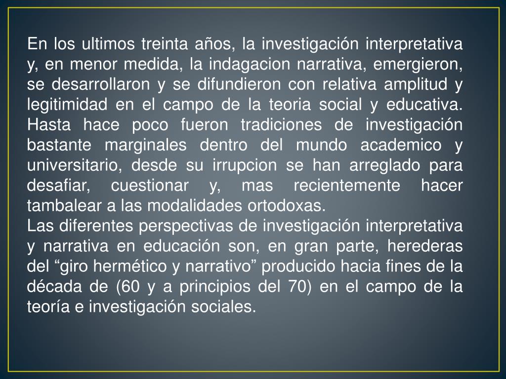 En los ultimos treinta años, la investigación interpretativa y, en menor medida, la indagacion narrativa, emergieron, se desarrollaron y se difundieron con relativa amplitud y legitimidad en el campo de la teoria social y educativa. Hasta hace poco fueron tradiciones de investigación bastante marginales dentro del mundo academico y universitario, desde su irrupcion se han arreglado para desafiar, cuestionar y, mas recientemente hacer tambalear a las modalidades ortodoxas. Las diferentes perspectivas de investigación interpretativa y narrativa en educación son, en gran parte, herederas del “giro hermético y narrativo” producido hacia fines de la década de (60 y a principios del 70) en el campo de la teoría e investigación sociales.