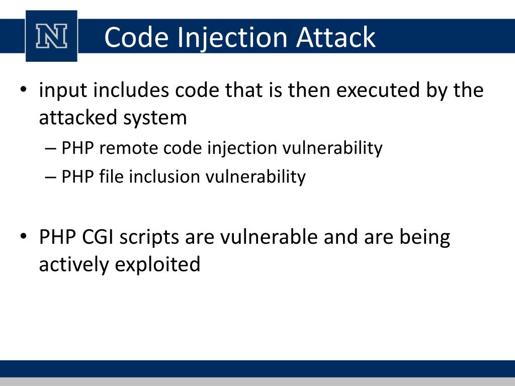 Code Injection Attack • input includes code that is then executed by the attacked system • PHP remote code injection vulnerability • PHP file inclusion vulnerability • PHP CGI scripts are vulnerable and are being actively exploited