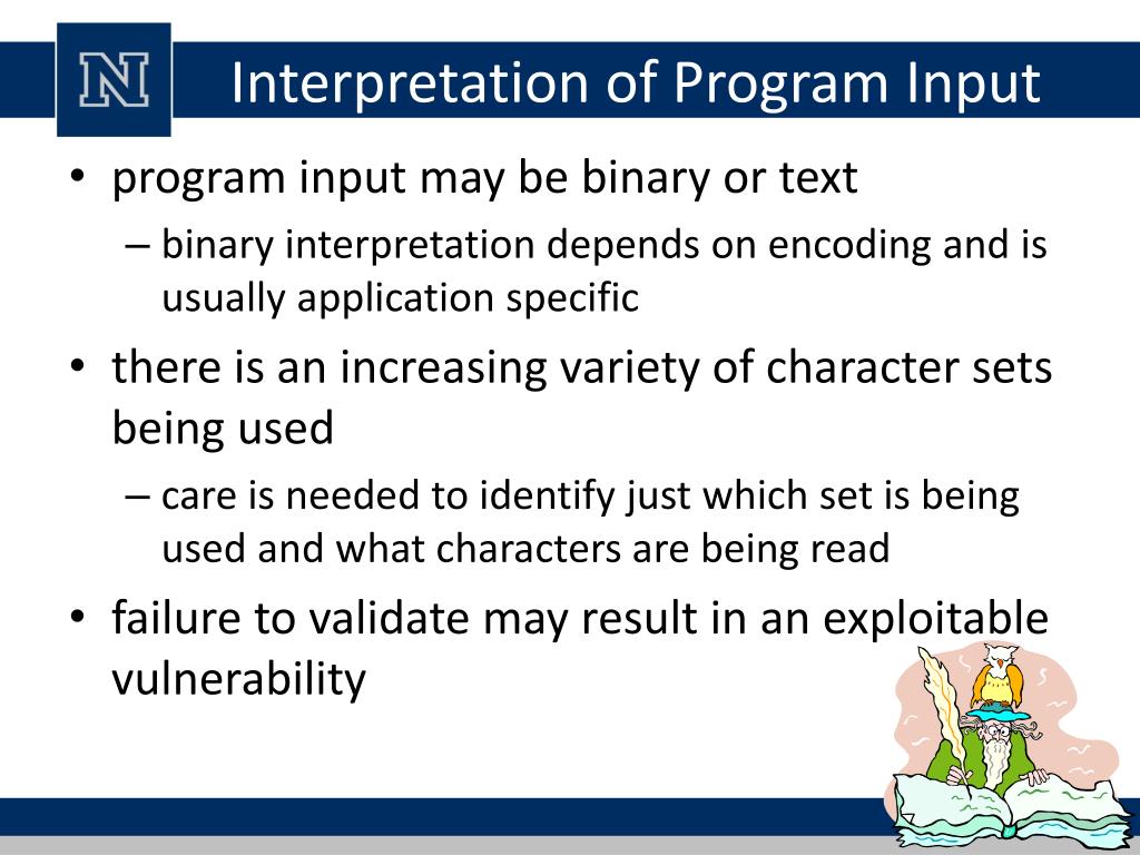 Interpretation of Program Input • program input may be binary or text • binary interpretation depends on encoding and is usually application specific • there is an increasing variety of character sets being used • care is needed to identify just which set is being used and what characters are being read • failure to validate may result in an exploitable vulnerability