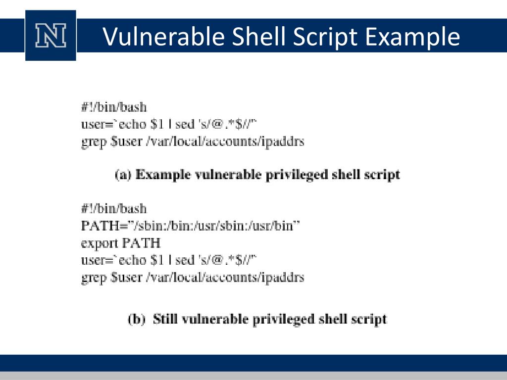 Vulnerable Compiled Programs • programs can be vulnerable to PATH variable manipulation • must reset to “safe” values • if dynamically linked may be vulnerable to manipulation of LD_LIBRARY_PATH • used to locate suitable dynamic library • must either statically link privileged programs or prevent use of this variable