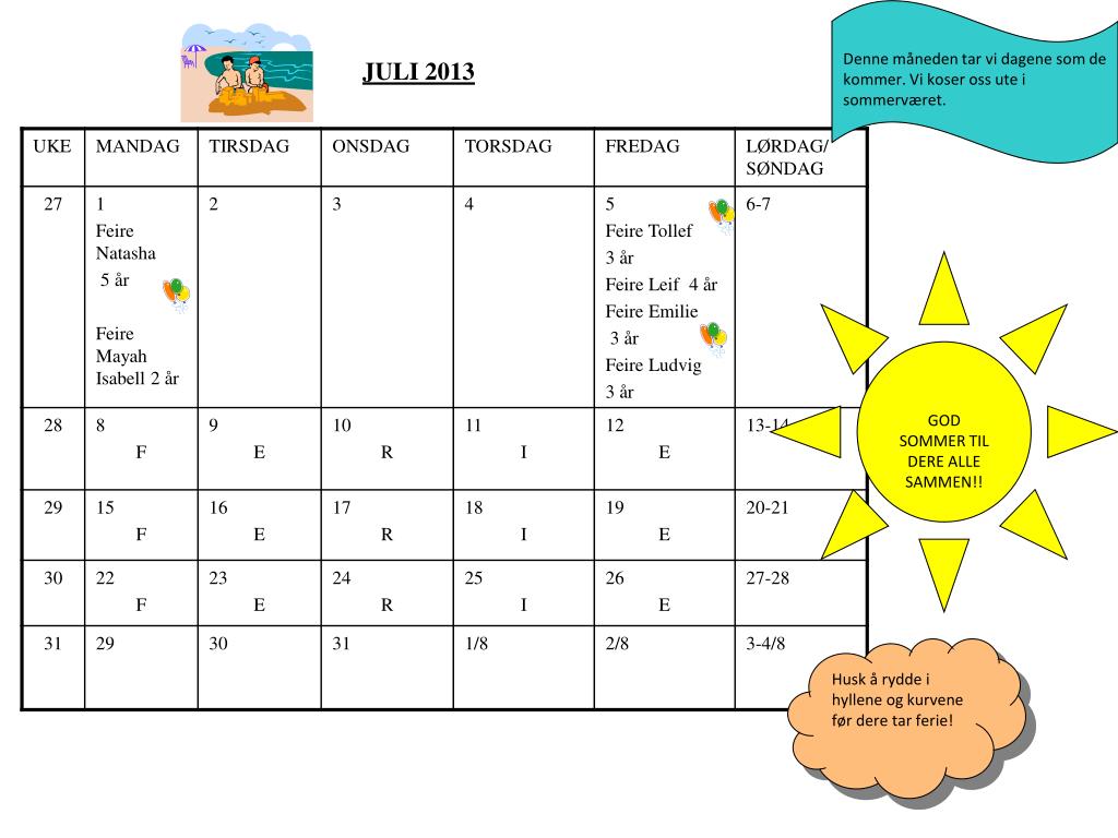 Denne måneden tar vi dagene som de kommer. Vi koser oss ute i sommerværet. JULI 2013 GOD SOMMER TIL DERE ALLE SAMMEN!! Husk å rydde i hyllene og kurvene før dere tar ferie!