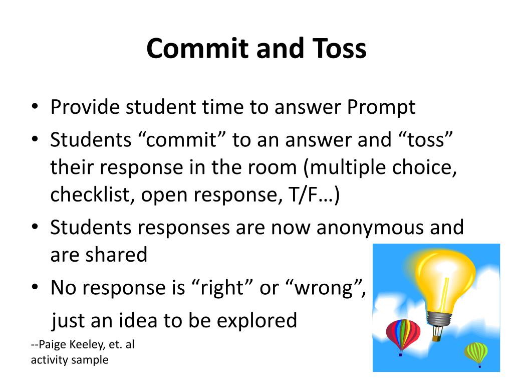 Commit and Toss • Provide student time to answer Prompt • Students “commit” to an answer and “toss” their response in the room (multiple choice, checklist, open response, T/F…) • Students responses are now anonymous and are shared • No response is “right” or “wrong”, just an idea to be explored --Paige Keeley, et. al activity sample