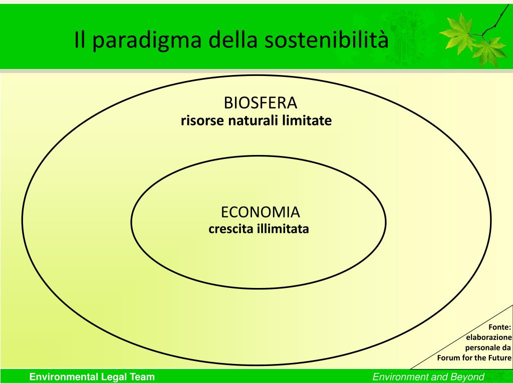 Il paradigma della sostenibilità BIOSFERA ECONOMIA risorse naturali limitate crescita illimitata Fonte: elaborazione personale da Forum for the Future