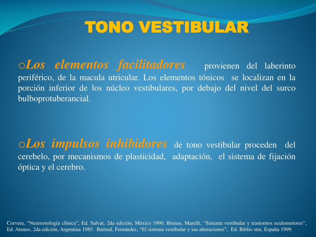 TONO VESTIBULAR • Los elementos facilitadores provienen del laberinto periférico, de la macula utricular. Los elementos tónicos se localizan en la porción inferior de los núcleo vestibulares, por debajo del nivel del surco bulboprotuberancial. • Los impulsos inhibidores de tono vestibular proceden del cerebelo, por mecanismos de plasticidad, adaptación, el sistema de fijación óptica y el cerebro. Corvera, “Neurootologia clínica”, Ed. Salvat, 2da edición, México 1990. Brunas, Marelli, “Sistema vestibular y trastornos oculomotores”, Ed. Ateneo, 2da edición, Argentina 1985. Bartual, Fernández, “El sistema vestibular y sus alteraciones”, Ed. Biblio stm, España 1999.