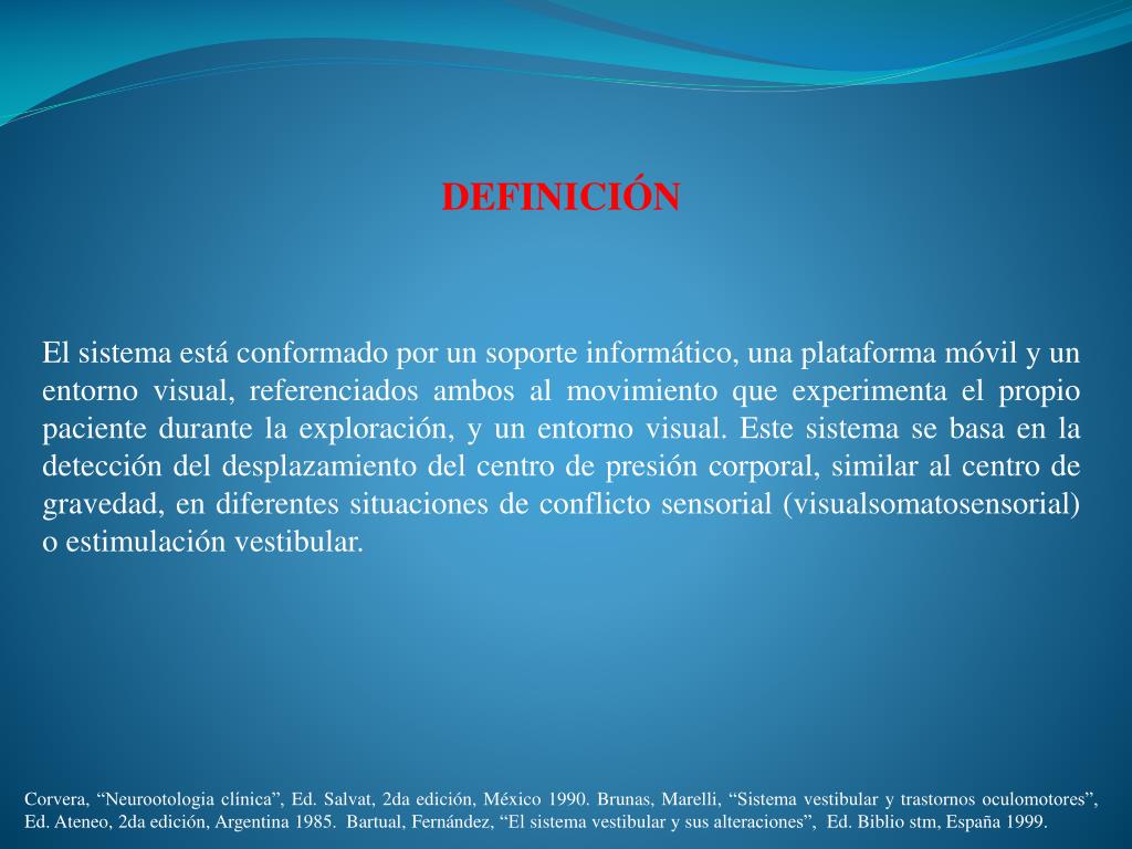 DEFINICIÓN El sistema está conformado por un soporte informático, una plataforma móvil y un entorno visual, referenciados ambos al movimiento que experimenta el propio paciente durante la exploración, y un entorno visual. Este sistema se basa en la detección del desplazamiento del centro de presión corporal, similar al centro de gravedad, en diferentes situaciones de conflicto sensorial (visualsomatosensorial) o estimulación vestibular. Corvera, “Neurootologia clínica”, Ed. Salvat, 2da edición, México 1990. Brunas, Marelli, “Sistema vestibular y trastornos oculomotores”, Ed. Ateneo, 2da edición, Argentina 1985. Bartual, Fernández, “El sistema vestibular y sus alteraciones”, Ed. Biblio stm, España 1999.