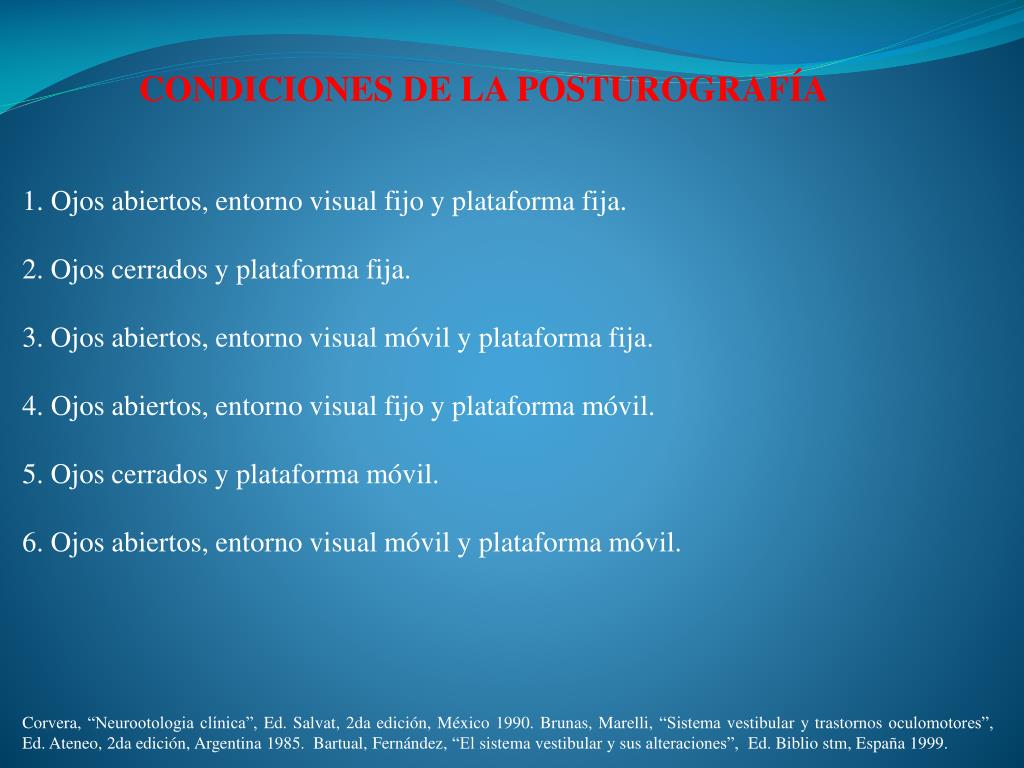 CONDICIONES DE LA POSTUROGRAFÍA • 1. Ojos abiertos, entorno visual fijo y plataforma fija. • 2. Ojos cerrados y plataforma fija. • 3. Ojos abiertos, entorno visual móvil y plataforma fija. • 4. Ojos abiertos, entorno visual fijo y plataforma móvil. • 5. Ojos cerrados y plataforma móvil. • 6. Ojos abiertos, entorno visual móvil y plataforma móvil. Corvera, “Neurootologia clínica”, Ed. Salvat, 2da edición, México 1990. Brunas, Marelli, “Sistema vestibular y trastornos oculomotores”, Ed. Ateneo, 2da edición, Argentina 1985. Bartual, Fernández, “El sistema vestibular y sus alteraciones”, Ed. Biblio stm, España 1999.
