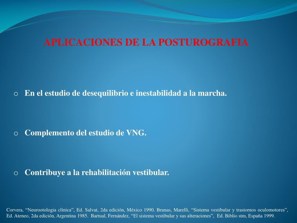 APLICACIONES DE LA POSTUROGRAFIA • En el estudio de desequilibrio e inestabilidad a la marcha. • Complemento del estudio de VNG. • Contribuye a la rehabilitación vestibular. Corvera, “Neurootologia clínica”, Ed. Salvat, 2da edición, México 1990. Brunas, Marelli, “Sistema vestibular y trastornos oculomotores”, Ed. Ateneo, 2da edición, Argentina 1985. Bartual, Fernández, “El sistema vestibular y sus alteraciones”, Ed. Biblio stm, España 1999.
