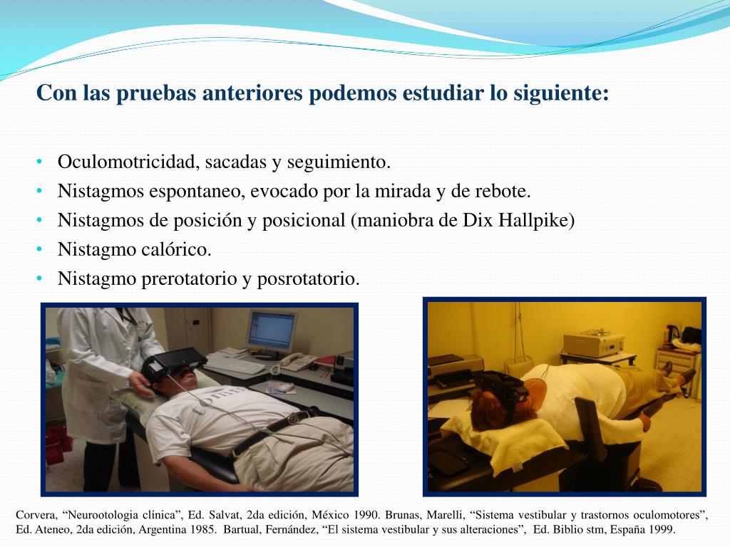 Con las pruebas anteriores podemos estudiar lo siguiente: • Oculomotricidad, sacadas y seguimiento. • Nistagmos espontaneo, evocado por la mirada y de rebote. • Nistagmos de posición y posicional (maniobra de Dix Hallpike) • Nistagmo calórico. • Nistagmo prerotatorio y posrotatorio. Corvera, “Neurootologia clínica”, Ed. Salvat, 2da edición, México 1990. Brunas, Marelli, “Sistema vestibular y trastornos oculomotores”, Ed. Ateneo, 2da edición, Argentina 1985. Bartual, Fernández, “El sistema vestibular y sus alteraciones”, Ed. Biblio stm, España 1999.