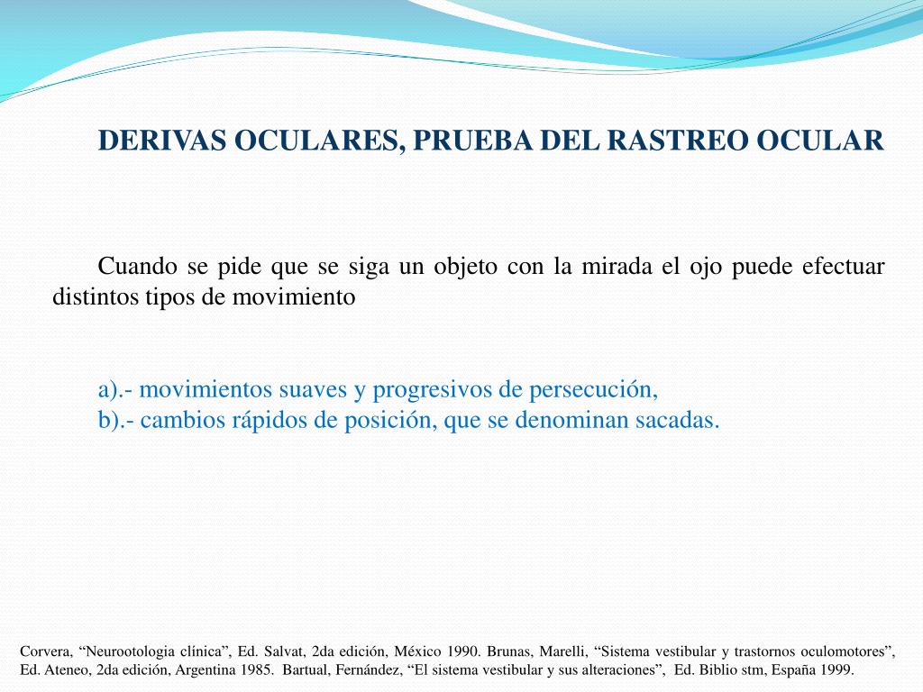 DERIVAS OCULARES, PRUEBA DEL RASTREO OCULAR Cuando se pide que se siga un objeto con la mirada el ojo puede efectuar distintos tipos de movimiento a).- movimientos suaves y progresivos de persecución, b).- cambios rápidos de posición, que se denominan sacadas. Corvera, “Neurootologia clínica”, Ed. Salvat, 2da edición, México 1990. Brunas, Marelli, “Sistema vestibular y trastornos oculomotores”, Ed. Ateneo, 2da edición, Argentina 1985. Bartual, Fernández, “El sistema vestibular y sus alteraciones”, Ed. Biblio stm, España 1999.