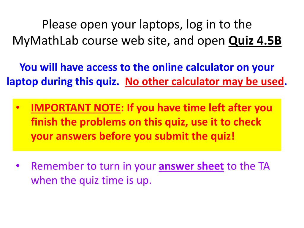 You will have access to the online calculator on your laptop during this quiz. No other calculator may be used . Please open your laptops, log in to the MyMathLab course web site, and open Quiz 4.5B.