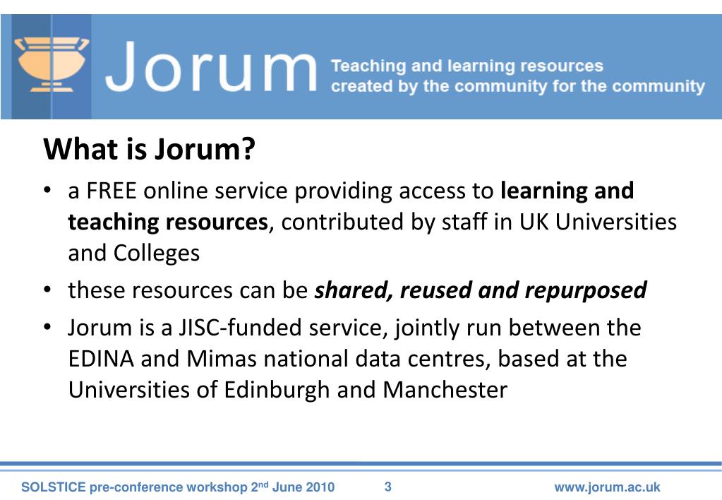 What is Jorum? • a FREE online service providing access to learning and teaching resources, contributed by staff in UK Universities and Colleges • these resources can be shared, reused and repurposed • Jorum is a JISC-funded service, jointly run between the EDINA and Mimas national data centres, based at the Universities of Edinburgh and Manchester www.jorum.ac.uk