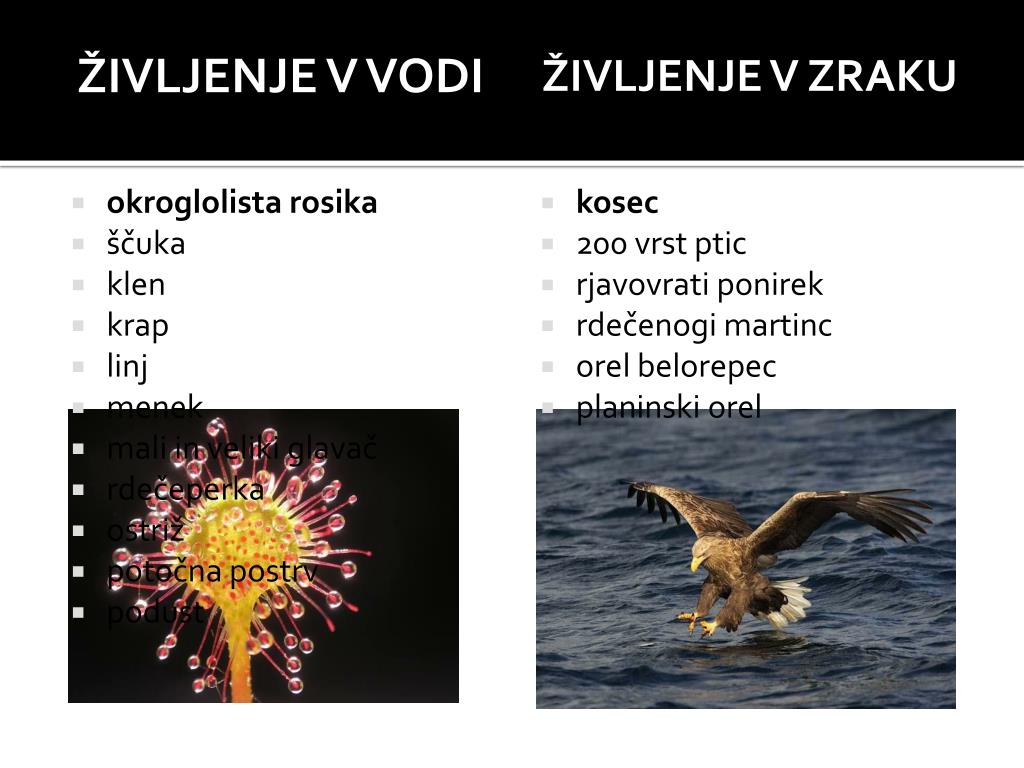 Življenje v vodi Življenje v zraku kosec 200 vrst ptic rjavovrati ponirek rdečenogi martinc orel belorepec planinski orel • okroglolista rosika • ščuka • klen • krap • linj • menek • mali in veliki glavač • rdečeperka • ostriž • potočna postrv • podust