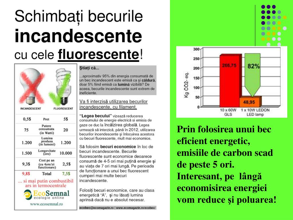 Reducerea consumului de energie în şcoala noastră prin înlocuirea becurilor incandescente cu cele fluorescente ar duce la ׃ • • economisirea a 10.368 kw/h energie electrică; • • reducerea emisiilor de dioxid de carbon în atmosferă cu 9,33 tone; • • reducerea emisiilor de SO2 din atmosferă cu 54950,4 metri cubi; • • eliminarea a 1,47 autovehicule pentru totdeauna din circulaţie; • • economisirea a 3,77 tone de benzină; • • echivalentul a 9 copaci plantaţi anual.