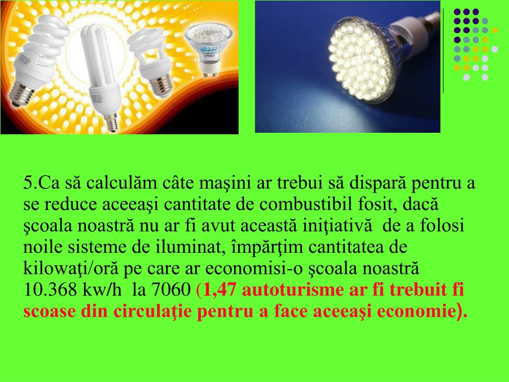 5.Ca să calculăm câte maşini ar trebui să dispară pentru a se reduce aceeaşi cantitate de combustibil fosit, dacă şcoala noastră nu ar fi avut această iniţiativă de a folosi noile sisteme de iluminat, împărţim cantitatea de kilowaţi/oră pe care ar economisi-o şcoala noastră 10.368kw/h la 7060 (1,47 autoturisme ar fi trebuit fi scoase din circulaţie pentru a face aceeaşi economie).
