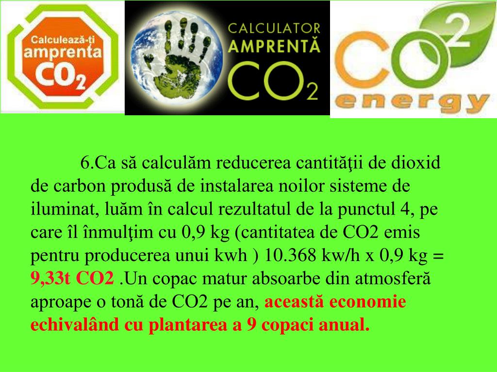 6.Ca să calculăm reducerea cantităţii de dioxid de carbon produsă de instalarea noilor sisteme de iluminat, luăm în calcul rezultatul de la punctul 4, pe care îl înmulţim cu 0,9 kg (cantitatea de CO2 emis pentru producerea unui kwh ) 10.368 kw/h x 0,9 kg =9,33t CO2 .Un copac matur absoarbe din atmosferă aproape o tonă de CO2 pe an, această economie echivalând cu plantarea a 9 copaci anual.