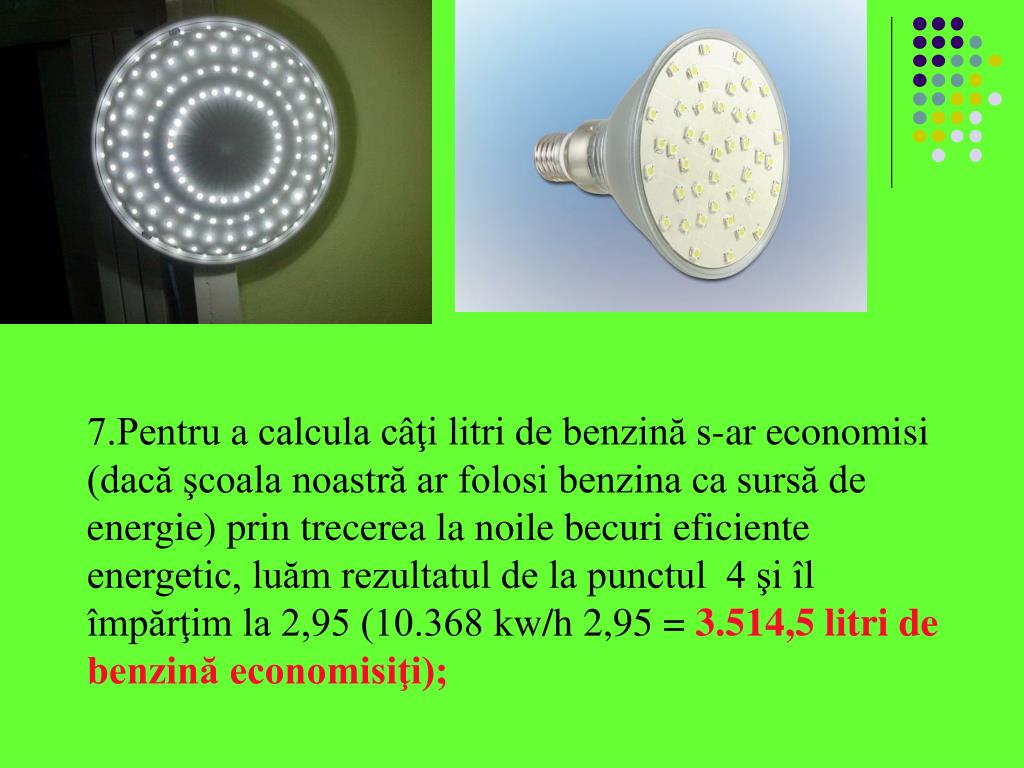 7.Pentru a calcula câţi litri de benzină s-ar economisi (dacă şcoala noastră ar folosi benzina ca sursă de energie) prin trecerea la noile becuri eficiente energetic, luăm rezultatul de la punctul 4 şi îl împărţim la 2,95 (10.368kw/h 2,95 =3.514,5 litri de benzină economisiţi);