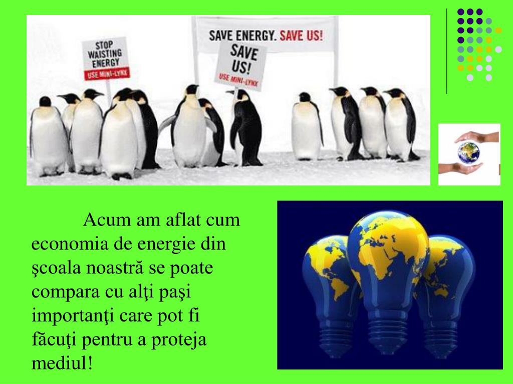 Acum am aflat cum economia de energie din şcoala noastră se poate compara cu alţi paşi importanţi care pot fi făcuţi pentru a proteja mediul!
