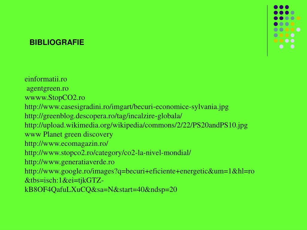 BIBLIOGRAFIE einformatii.ro agentgreen.ro wwww.StopCO2.ro http://www.casesigradini.ro/imgart/becuri-economice-sylvania.jpg http://greenblog.descopera.ro/tag/incalzire-globala/ http://upload.wikimedia.org/wikipedia/commons/2/22/PS20andPS10.jpg www Planet green discovery http://www.ecomagazin.ro/ http://www.stopco2.ro/category/co2-la-nivel-mondial/ http://www.generatiaverde.ro http://www.google.ro/images?q=becuri+eficiente+energetic&um=1&hl=ro&tbs=isch:1&ei=tjkGTZ-kB8OF4QafuLXuCQ&sa=N&start=40&ndsp=20