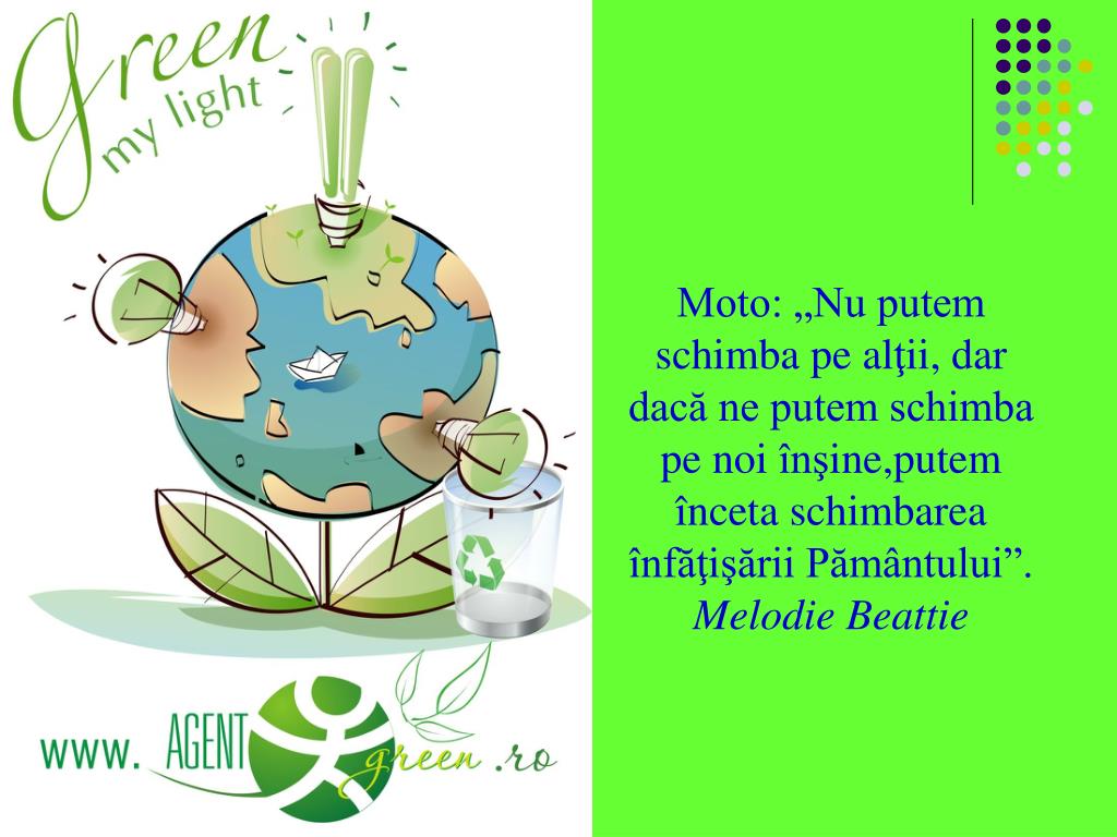 Moto: „Nu putem schimba pe alţii, dar dacă ne putem schimba pe noi înşine,putem înceta schimbarea înfăţişării Pământului”. Melodie Beattie