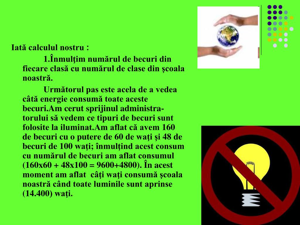 Iată calculul nostru ׃ 1.Înmulţim numărul de becuri din fiecare clasă cu numărul de clase din şcoala noastră. Următorul pas este acela de a vedea câtă energie consumă toate aceste becuri.Am cerut sprijinul administra- torului să vedem ce tipuri de becuri sunt folosite la iluminat.Am aflat că avem 160 de becuri cu o putere de 60 de waţi şi 48 de becuri de 100 waţi;înmulţind acest consum cu numărul de becuri am aflat consumul (160x60 + 48x100 = 9600+4800). În acest moment am aflat câţi waţi consumă şcoala noastră când toate luminile sunt aprinse (14.400) waţi.