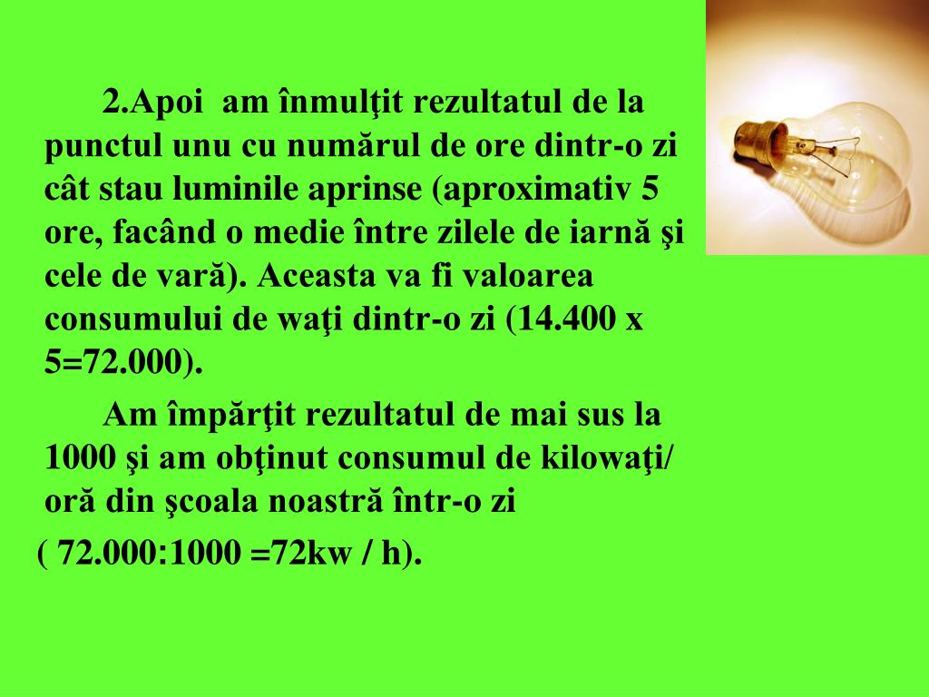 2.Apoi am înmulţit rezultatul de la punctul unu cu numărul de ore dintr-o zi cât stau luminile aprinse (aproximativ 5 ore, facând o medie între zilele de iarnă şi cele de vară). Aceasta va fi valoarea consumului de waţi dintr-o zi (14.400 x 5=72.000). Am împărţit rezultatul de mai sus la 1000 şi am obţinut consumul de kilowaţi/ oră din şcoala noastră într-o zi ( 72.000׃1000 =72kw / h).