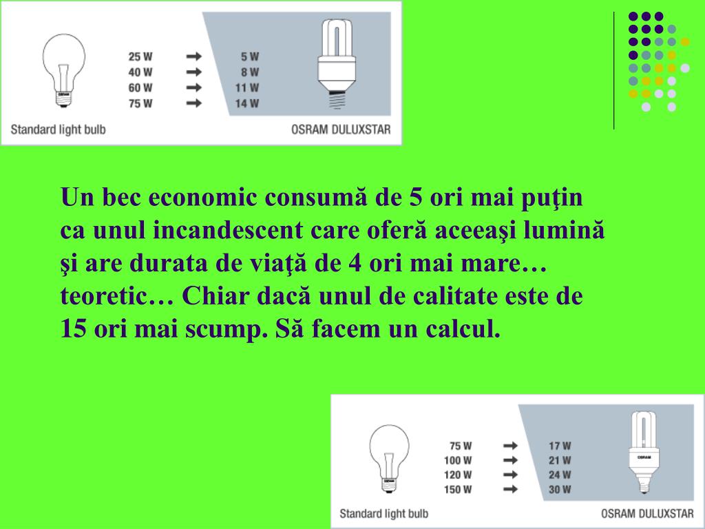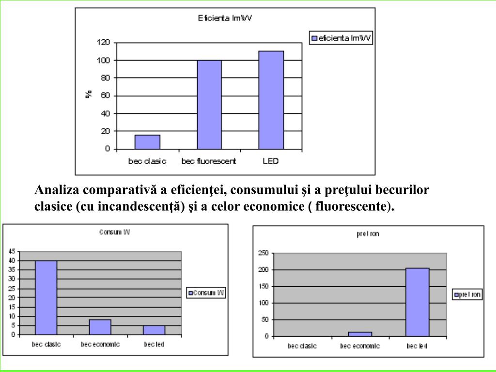 Analiza comparativă a eficienţei, consumului şi a preţului becurilor clasice (cu incandescenţă) şi a celor economice (fluorescente).